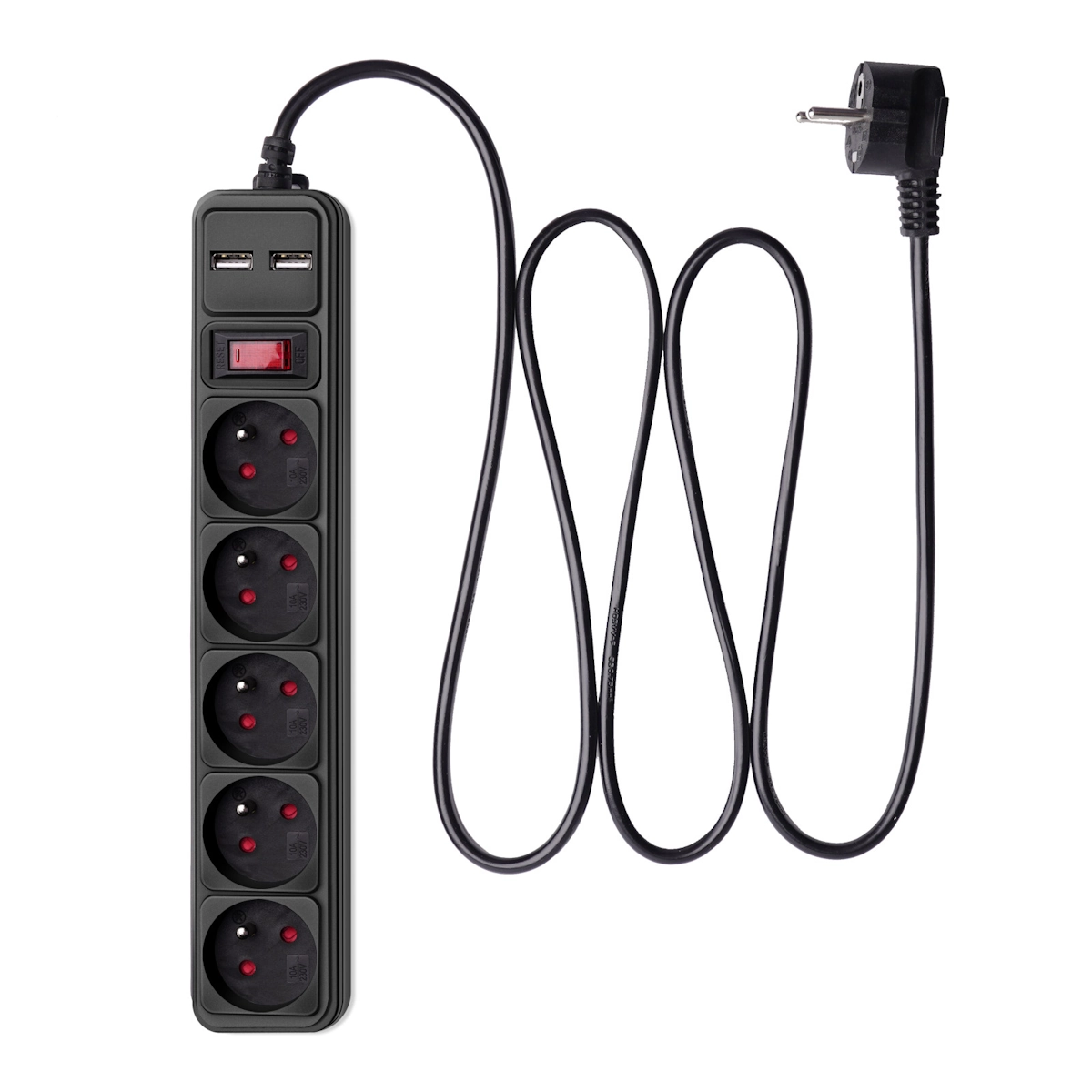 The Akyga® AK-SP-05U power strip is used to connect electrical devices to a power source. It is equipped with five CEE 7/5 sockets, so you can power many devices at the same time. In addition, two USB ports have been placed on top of the surge protector. These will allow you to charge mobile devices such as smartphones or tablets without additional chargers.